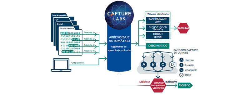 Capture Advanced Threat Protection (Capture ATP) revoluciona la detección de amenazas avanzadas y el sandboxing, con una solución multimotor basada en la nube, permite detener los ataques de día zero y las amenazas desconocidas bloqueándolas hasta que haya un veredicto.