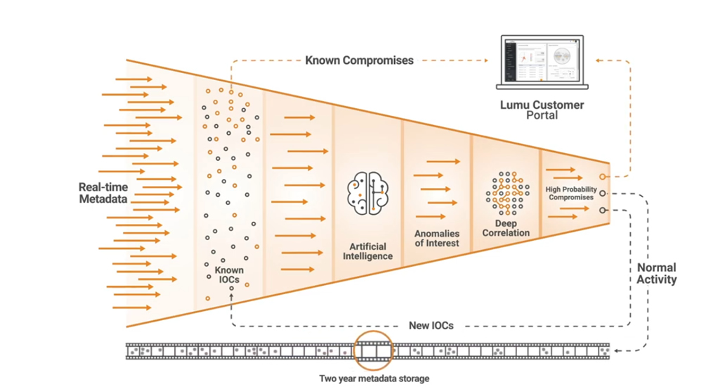 • 4. Finalmente, los metadatos que nos son iluminados por el proceso se almacenan por hasta 2 años para que cuando haya nuevos IOCs saber si la red se ha estado comunicando con dichos IOCs que ahora son conocidos, esto se logra gracias a un proceso propietario de Playback que compara cada nuevo IOC contra 2 años de metadatos de red para cada cliente que protegemos, esto marca un diferencial único de LUMU que es fundamental para detectar compromisos rápidamente.